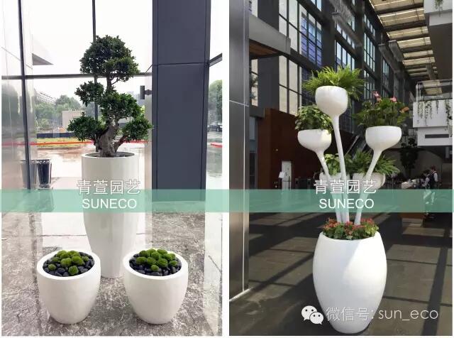 东大堂是酒店的入口,对迎宾植物和盆器要求有造型感,且兼具古典气质,青萱的设计师推荐了造型榕树搭配白色订制盆器,在传统和现代之间达到了很好的平衡。西大堂是办公楼的入口,通过运用两组造型优美的玻璃钢花盆,给人以耳目一新的视觉观感。
