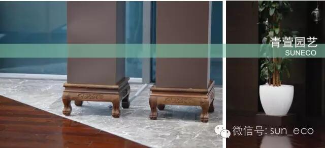 除了植物的选择、盆器的搭配,盆器底座的运用也是该项目的一个亮点。在某些关键点位,一个形神兼备的底座,对整个绿植装饰效果往往起到画龙点睛的作用。